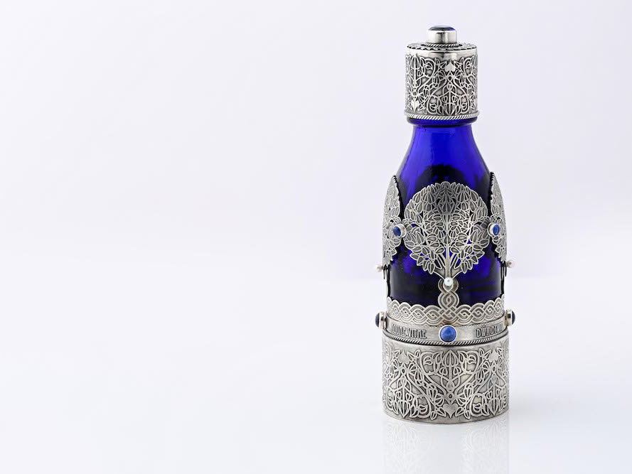 Vintage glass bottle, fine silver, sterling silver, sapphire, blue spinel, fresh water pearls, organic apple seeds & spring water